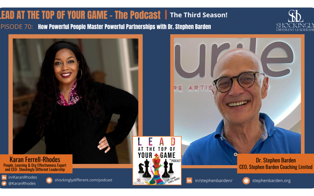 Oh, wonderful. We loved having you. And thank you also listeners for tuning in to another episode. We know that there are many podcasts you can listen to. But we’re very honored that you joined us again for this week. And hopefully see you next week as well. Have a great one. Well, I hope you enjoyed our conversation today with Dr. Stephen Barden, founder and CEO of Stephen Barden Coaching, Limited links to his bio, his entry into our leadership playbook and additional resources can be found in the show notes on your favorite podcast platform of choice and on the web at leads your game podcast.com. And now for Karan’s Take on today’s topic of leveraging partnerships to be a better leader. In addition to what great insights Stephen has shared with us, I’d like to share just a few more thoughts. You know, while partnering with others can be complex, if you can navigate how to do so it has the potential to fast track your leadership efforts faster than if you had to operate alone. And to do this effectively, I feel you need to do three things. One, find out what your team or potential colleagues desire value. Don’t guess ladies and gentlemen, take the time to talk to them one on one because every human has their own set of values and list of incentives that will be meaningful for them. Secondly, during your conversation, take the time to validate which individuals would actually benefit from partnering with you. Just because someone has the knowledge or skills does not mean that they have the time or motivation. And without these to present, you’re inviting trouble onto your team. And then lastly, once you have your partners or teammates identified and bought in then I suggest that you be intentional, intentional about aligning all of them behind your leadership effort at hand and then motivating them to execute as much as you can without betraying their confidences. I really encourage you to invite the members of your team to be transparent about what a quote unquote win would be for them this way the entire team can be accountable for ensuring everyone gets what they need from the experience, versus only you been accountable alone. Just because you have the title of leader, for example, you can say something like, Hey, Jim, I know you wanted to learn more about pricing. So why don’t you take the lead in working with the consulting firm to evaluate the pricing and market data that they’ve come with and help see where the trends are. By doing so this verbal validation will help each of your team members feel heard, and will go a long way in increasing goodwill. So those are a couple things just to think about. And that’s all for today. But please remember to subscribe to the podcast and share with just one friend. Because by doing so you will empower them to also leave at the top of their game. Thanks again for listening and see you next week. And that’s our show for today. Thank you for listening to the lead at the top of your game podcast, where we help you lead your seat at any employer, business, or industry in which you choose to play. You can check out the show notes, additional episodes, and bonus resources, and also submit guest recommendations on our website at leadyourgamepodcast.com. You can follow me on Twitter, Facebook, Instagram, and LinkedIn by searching for the name Karan Rhodes with Karan being spelled K a r a n. And if you like the show, the greatest gift you can give would be to subscribe and leave a rating on your podcast platform of choice. This podcast has been a production of Shockingly Different Leadership, a global consultancy which helps organizations execute their people, talent development, and organizational effectiveness initiatives on an on-demand, project, or contract basis. Huge thanks to our production and editing team for a job well done. Goodbye for now.
